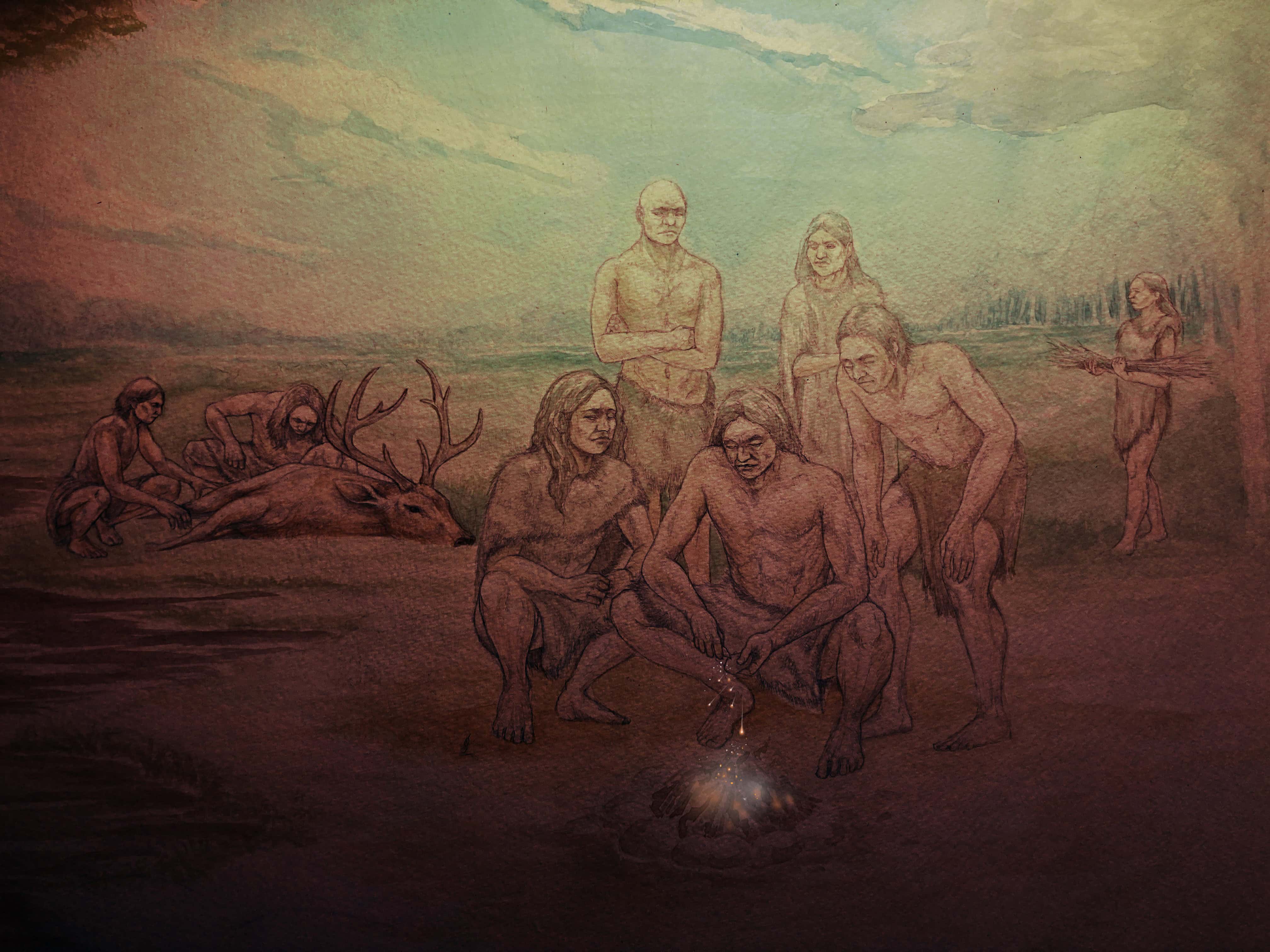 Artist’s reconstruction of a group of early humans gathered around a fire after dusk. (Credit: Craig Williams, Illustrator, Department of Europe and Prehistory)