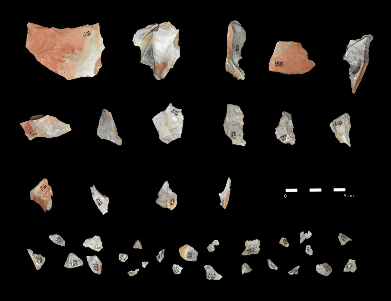 The pieces of the A2 cluster before refitting. The fine knapping of the top left one was an incentive to attempt refitting. (Photo: Claire Lucas)