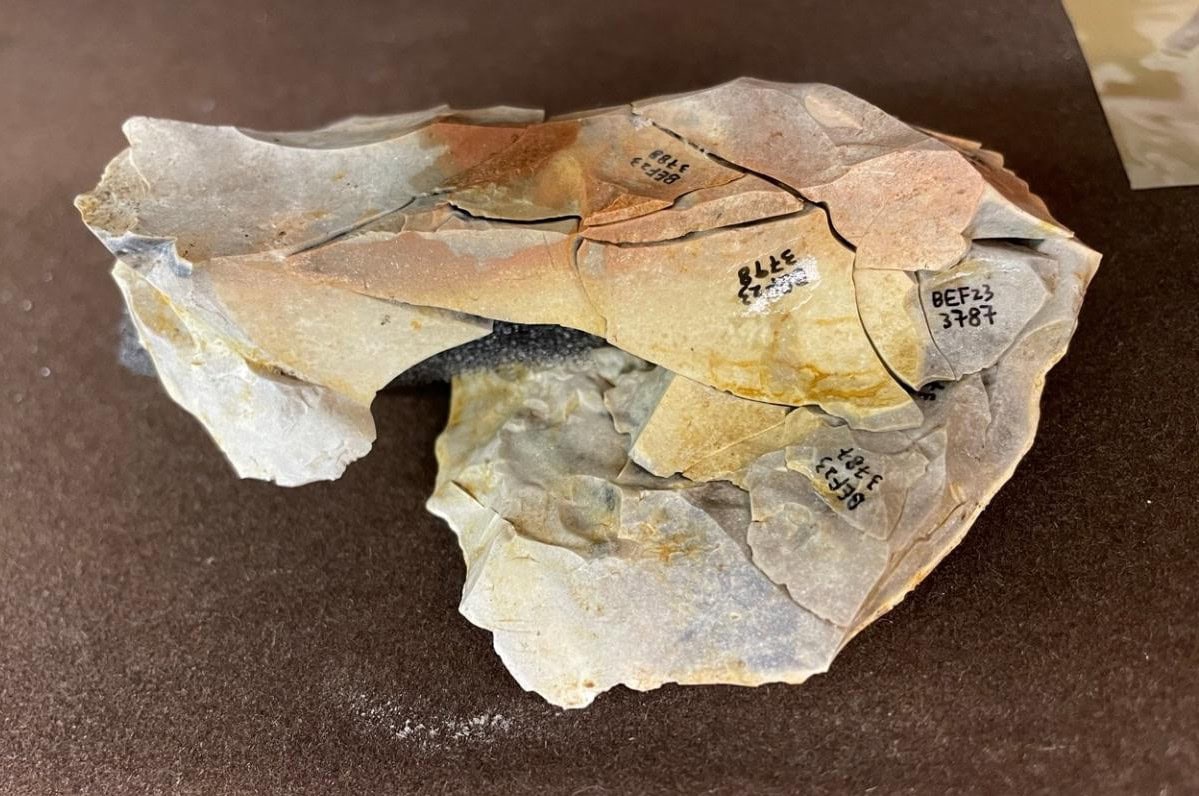 Flint may explode when heated to high temperatures. Refitting heat shattered materials, even unknapped stones, is a way to appreciate the effects of fire on the whole block and map the fragments distribution to see how they moved across the site. The idea of attempting such refitting had emerged on site as quantities of heat shattered flint were found alongside handaxe manufacturing flakes in the Areas I and VI of Barnham East Farm. In the field, all burning evidence was thoroughly recorded with a question in mind: Did the hominins who produced handaxes here also make fire or could it result from a wildfire? Amongst the methods available to characterize burning events, refitting is always a long shot as it is an uncertain, time-consuming exercise. In the summer 2023, the discovery of a heated flint cluster including a finely knapped fragment in square A2 finally convinced us it was worth trying.