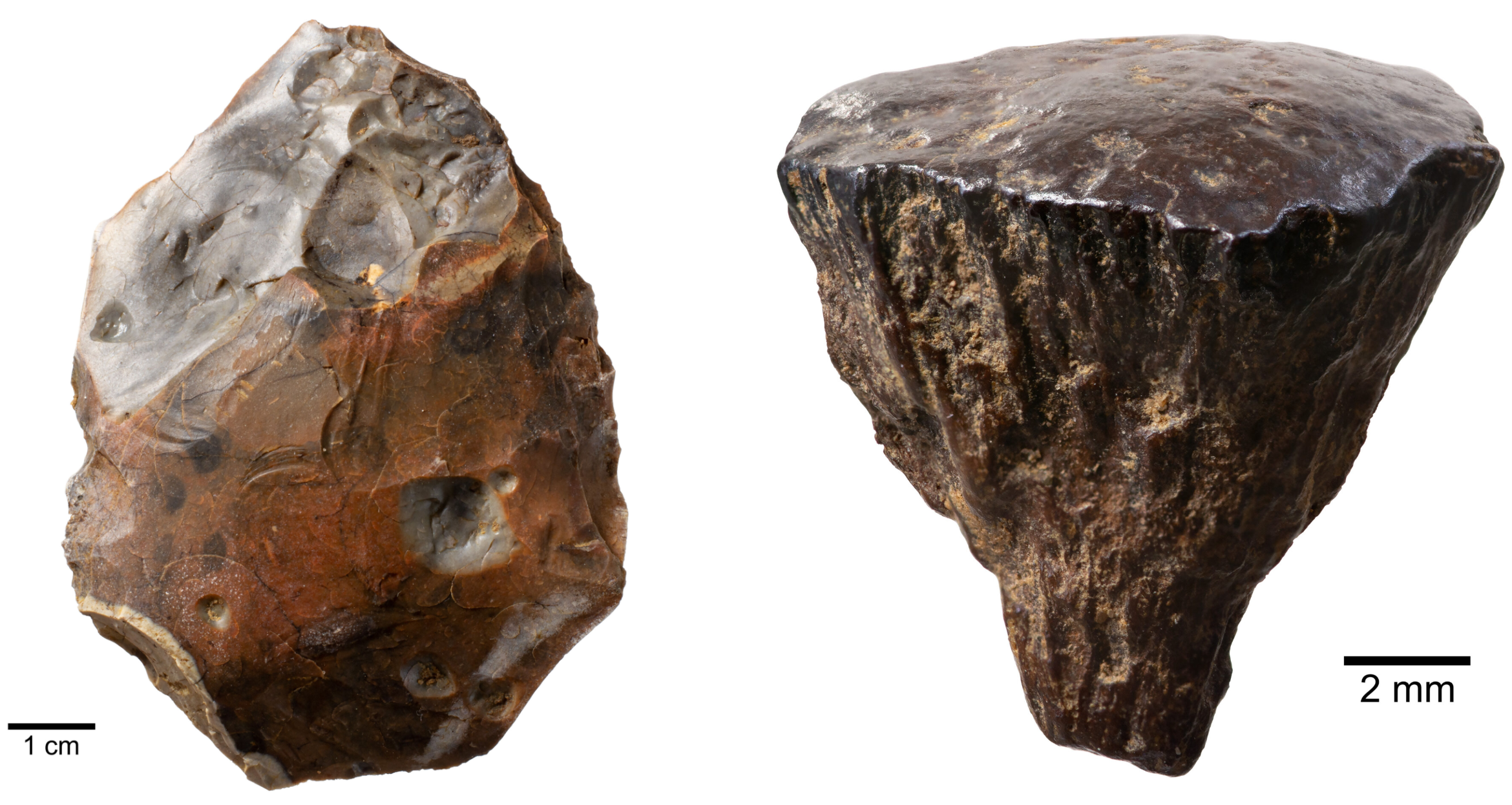 Evidence of actually making fire comes from two tiny pieces of iron pyrite that were also found in the ancient soil. Although the pieces are oxidised, the radial crystal structure of the fragments indicates pyrite, a natural mineral that in later periods was often used to strike against flint to create sparks for lighting fires.