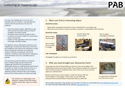 We are working to create resources to support Palaeolithic artefact collecting on the North Norfolk coast. Resources will include a guide on how to recognise worked flint, how best to document your finds, and a general guide to the Palaeolithic archaeology of the Happisburgh area.
